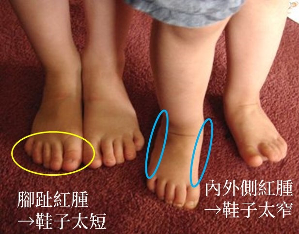 (1) 定期檢查:每一個月檢查小朋友的鞋子大小一次,在幼兒時期可能一年腳就會長大3個尺寸,在學齡時,一年可能就會大2個尺寸,可以檢查小朋友在腳趾頭及腳的內外側的位置是否在拖鞋後出現紅腫,若在腳趾則表示鞋子太短,若在足部的內外側,則表示鞋子太窄了,